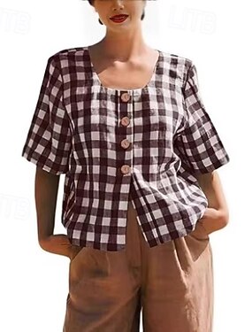Per donna Camicia Estiva Camicia casual Blusa Bottoni Plaid Vintage Quotidiano Elegante Manica Corta Collo quadrato Top Regolari Quotidiano Ferie Uscire Marrone Estate Primavera