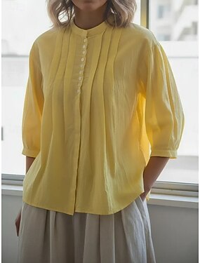 Per donna Blusa Finto cotone e lino Bottoni Tinta unica Elegante Casual Manica Lunga Collo Alto Top Regolari Quotidiano Blu Bianco Giallo Rosso Azzurro cielo Estate Primavera Autunno