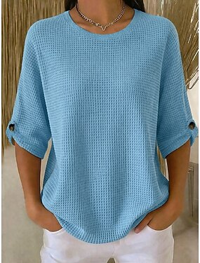 Per donna Camicia a nido d'ape Maglietta Waffle Maglietta Waffle Lounge Maglietta Bottoni Tinta unica Elegante Casual Manica 3/4 Girocollo Top Regolari Quotidiano Blu Viola Arancione Cachi Primavera
