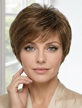 Parrucca corta marrone a strati con taglio pixie e frangia per donna - capelli sintetici lisci naturali con mèches
