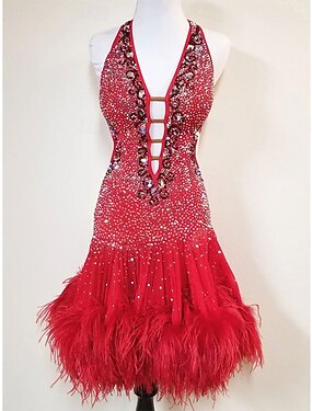 vestito da ballo latino da donna, rosso, strass, scollo a V profondo, orlo con piume, sexy, senza schienale, costume da competizione per salsa, cha cha, rumba