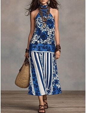 Per donna Abito maxi Vestito Casual Vestito in Chiffon Vestito a ruota Abiti Boho Chic Bohemien Vacanza Tropicale Spiaggia Ferie Data Vestibilità regolare Floreale Senza Maniche All'americana Blu Blu