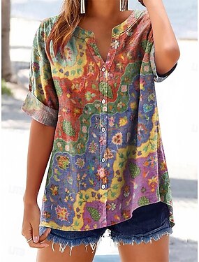 Per donna Camicia Camicia casual Camicia da Spiaggia Blusa Stampato Geometrico Bohemien Elegante Moderno Manica Corta Scollo a V Top Regolari Quotidiano Ferie Uscire Blu Giallo Vino Viola Estate