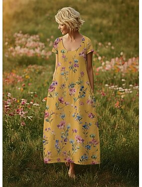 Per donna Abito lungo maxi Abito Boho Vestito Casual Vintage Quotidiano All'aperto Spiaggia Vestibilità comoda Floreale Manica Corta Collo a U Giallo Estate Primavera