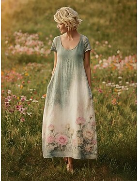 Abito maxi in lino donna in misto cotone abito a trapezio vacanza casual boho quotidiano vestibilità ampia tinta unita maniche corte colletto a giro blu nero bianco verde chiaro estate primavera