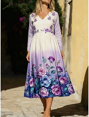 Per donna Abito Midi Abito Boho Vestito Casual Moda Quotidiano All'aperto Vacanza Vestibilità regolare Floreale Manica Lunga Scollo a V Viola Estate Primavera Autunno