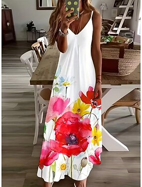Per donna Abito maxi Vestito Estivo Abito a trapezio Abito Estivo Vacanza Casual Boho Quotidiano Ferie Vestibilità regolare Floreale Grafico Senza Maniche Scollo a V All'americana Bianco Estate