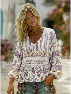 Per donna Camicia Camicia Boho Finto cotone e lino Stampato Floreale Grafico Paisley Bohemien Vintage Classico Manica Lunga Scollo a V Top Regolari Quotidiano Ferie Uscire Viola Estate Primavera