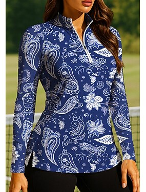 Per donna Boho Top Polo da golf Maglia da tennis Manica Lunga Stampato Zip a un quarto Pullover Protezione UV Elastico Traspirante Tennis Golf Pickleball Collo con zip Maglietta Polo Bianco e blu