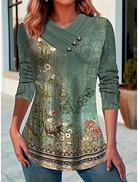 Per donna Maglietta Stampato Grafico Piante Tribale Vintage Elegante Casual Manica Lunga Scollo a V Collo a V Top Regolari Quotidiano Weekend Blu Viola Primavera Autunno Inverno