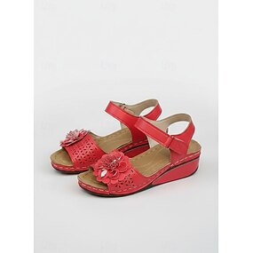 sandali rossi con zeppa da donna con decorazioni floreali e cinturino regolabile alla caviglia per outfit estivi e casual