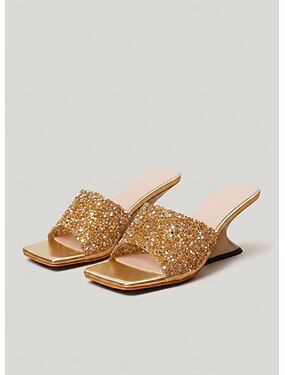mules da donna con tacco spesso e pizzo dorato glitterato – eleganti sandali peep-toe slip-on per feste e serate