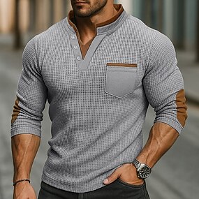 Per uomo Maglietta Waffle Maglia Henley a nido d'ape Camicie da uomo con toppe sui gomiti Manica Lunga Collo alla coreana Inverno Autunno Tutte le stagioni Tinta unica Moda Essenziale Casual Tasche