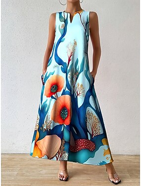 Per donna Abito maxi Vestito Estivo Abito a trapezio Vacanza Casual Boho Ferie Vestibilità comoda Floreale Grafico Senza Maniche Scollo a V Blu Giallo Arancione Estate Primavera