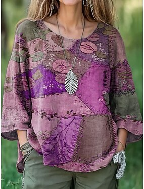 Per donna Blusa Stampato Floreale Etnico Retrò Vintage Manica 3/4 Girocollo Top Regolari Quotidiano Ferie Blu Viola Marrone Estate Primavera Autunno