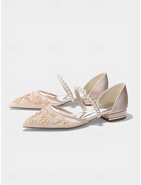 Ballerine da donna color champagne con cinturino ricamato in perle – eleganti scarpe da cocktail per feste.