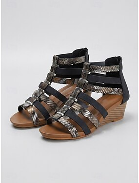 Sandali gladiatore con zeppa neri da donna – eleganti sandali con cinturini e stampa pitonata, comodi e imbottiti, scarpe estive alla moda per le vacanze e le feste in giardino. &abbigliamento