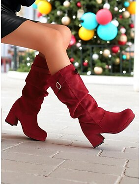 stivali da donna in pelle scamosciata rossa con fibbia, tacco a blocco spesso, eleganti e comodi, perfetti per l'inverno, il Natale e le occasioni informali
