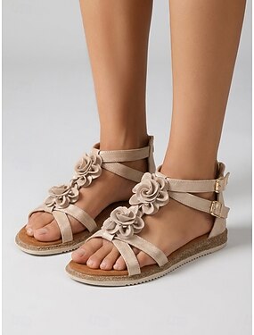 Sandali gladiatore da donna color albicocca con fiori in stile bohémien - comodi sandali bassi con cinturini per le vacanze estive e i matrimoni all'aperto. &viaggio romantico
