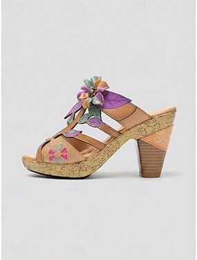 Sandali da donna in pelle color cammello con tacco a fiore – sandali aperti in punta stampati in stile artigianale con design floreale 3D, scarpe vintage con tacco in sughero per l'estate, feste in