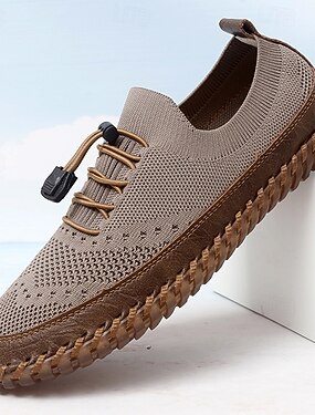 Scarpe da uomo beige slip-on in maglia, sneakers casual leggere e traspiranti, comode calzature da esterno per viaggi, passeggiate quotidiane e attività estive.