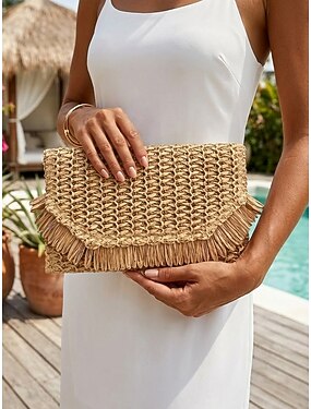 Pochette da donna in paglia stile bohémien, borsetta multicolore con decorazione a nappina, borsa leggera ed elegante per vacanze al mare, feste in spiaggia e uso quotidiano casual.