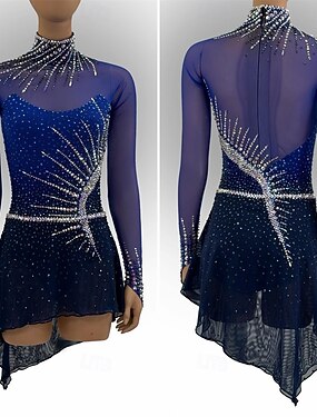 Abito da pattinaggio artistico Per donna Pattinaggio sul ghiaccio Vestito Blu Patchwork Orlo asimmetrico Elasticizzato Allenamento Competizione Vestiti da pattinaggio sul ghiaccio Classico Cristallo
