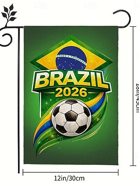 Bandiera da giardino per le Olimpiadi di Brasile 2026, con i colori della bandiera brasiliana e il design di un pallone da calcio con la scritta "Brasile 2026", una vivace decorazione per esterni per