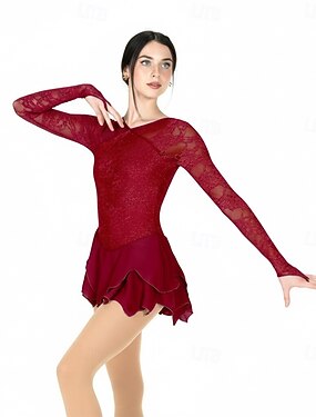 Abito da pattinaggio artistico Per donna Ragazze Pattinaggio sul ghiaccio Vestito Borgogna Patchwork Foro per il pollice Rete Spandex Alta elasticità Allenamento Competizione Vestiti da pattinaggio