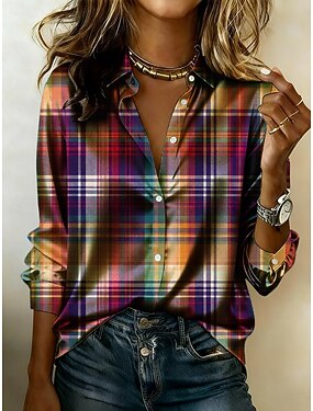Per donna Camicia Camicia in raso Stampato Grafico Plaid Vacanza Casual Manica Lunga Colletto a Camicia Top Regolari Quotidiano Ferie Uscire Arcobaleno Estate Primavera Autunno