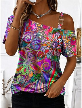 Per donna Maglietta Stampato Asimmetrico Grafico Astratto Vintage Moda Elegante Manica Corta Monospalla Senza Spalle Collo asimmetrico Top Regolari Quotidiano Uscire Weekend Blu Fucsia Estate