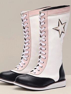 stivali alti da uomo con lacci bianchi e neri per cosplay con toppa a stella rosa e punta a contrasto, stile costume unico per spettacoli, festival e feste a tema