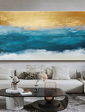 dipinti a olio fatti a mano, blu cielo oceano oro dipinto a mano dipinto blu scuro moderno astratto blu oro oceano tramonto paesaggio arte murale decorazione casa arredamento