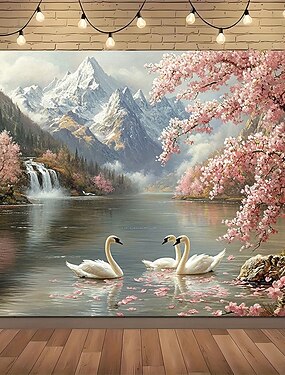 Lago del Cigno Bianco, paesaggio naturale, montagna innevata, fiori di ciliegio, fiori rosa, cascata, scenario sereno, arazzo da parete, grande sfondo per camera da letto, soggiorno, decorazione per