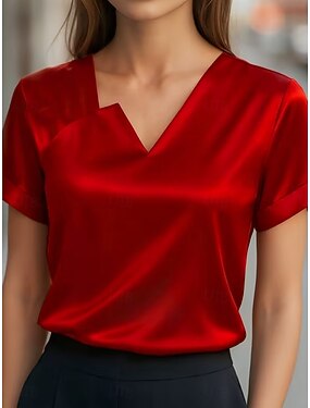 Per donna Camicia Camicia in raso Blusa Semplice Elegante Classico Moderno Manica Corta Scollo a V Top Regolari Quotidiano Ferie Uscire Nero Rosso Verde Estate Primavera