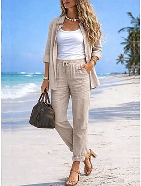 Per donna Set di Pantaloni Bolero Finto cotone e lino Manica Lunga Colletto a Camicia Tinta unica Moda Streetwear Casuale Quotidiano All'aperto Bianco Cachi Grigio scuro Estate Vestibilità regolare