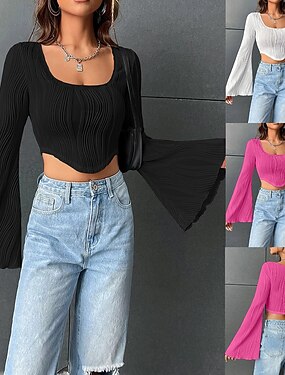 Per donna Blusa Tinta unica Elegante Casual Manica Lunga Collo a U Top corti Abbigliamento casual alla moda Ferie Uscire Nero Bianco Fucsia Primavera Autunno
