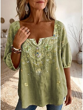 Per donna Blusa Finto cotone e lino Ricamato Floreale Elegante Casual Manica 3/4 Girocollo Top Regolari Quotidiano Blu Nero Rosa Verde Estate Primavera