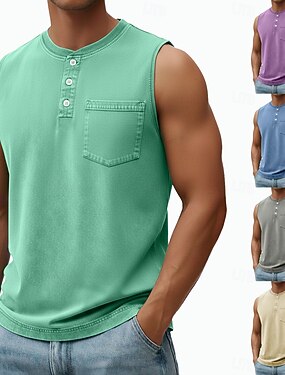 Per uomo Canotta Maglietta smanicata Camicia 100% cotone lavaggio acido Senza Maniche Henley Estate Semplice Moda Designer Essenziale Tasca Tinto in capo Bottoni Casuale Vacanza Streetwear Nero Verde