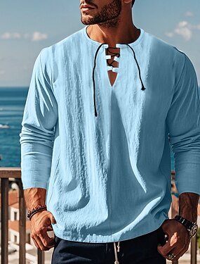 Per uomo Maglietta Camicia a Maniche Lunghe Maglietta in lino Manica Lunga Scollo a V Primavera Autunno Tinta unica Moda Streetwear Spiaggia Allacciato Casuale All'aperto Vacanza Nero Rosa Blu chiaro