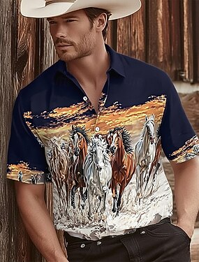 Per uomo Animale Cavallo Tramonto Camicia Camicia Western Camicia da cowboy Manica Corta Vintage Retrò All'aperto Lavoro Casual Quotidiano Estate Primavera Collo ripiegato Stampa 3D Camicie con