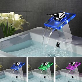 rubinetto del lavandino del bagno a led, cascata in ottone beccuccio in vetro a temperatura controllata a 3 colori finitura cromata in stile contemporaneo maniglia singola un foro con interruttore