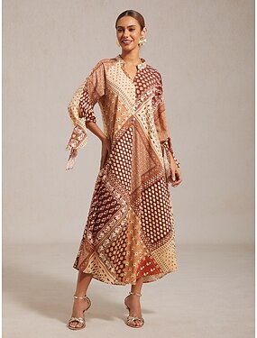 abito lungo da donna con stampa patchwork floreale geometrica, collo alto, manica 3/4, primavera autunno