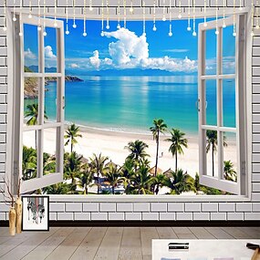 Arazzo da parete con vista sulla spiaggia in 3D, finta finestra, oceano, palme tropicali, paesaggio costiero, decorazione da parete per soggiorno, sala yoga