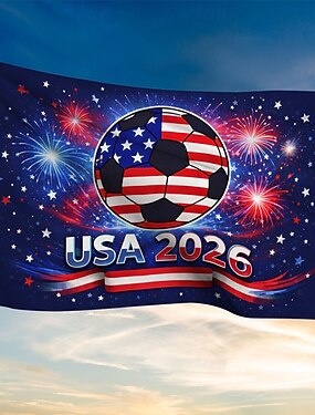 Bandiera celebrativa USA 2026 per il calcio - design patriottico con pallone da calcio con bandiera americana, fuochi d'artificio, stelle e "USA 2026", resistente