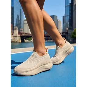 Scarpe da passeggio slip-on da donna color kaki: sneakers in maglia traspirante, scarpe comode e ammortizzate, perfette per viaggiare e fare commissioni. &abbigliamento casual quotidiano