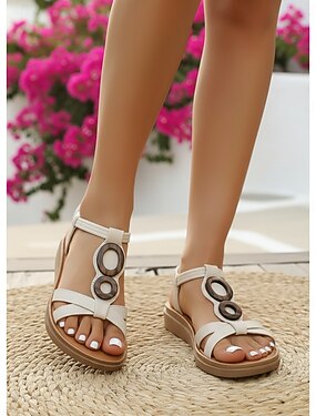 Sandali con zeppa da donna in stile bohémien, verde scuro - comode scarpe da passeggio con cinturino elastico sul retro e decorazione retrò con cerchi in legno, ideali per le vacanze estive e i viaggi