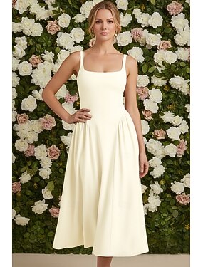Linea ad A Lunghezza Tè Abito Bianco Piccolo vestito bianco Elegante Schiena Scoperta Senza Maniche Spalline sottili Matrimonio Formale Tessuto Elasticizzato Senza schiena con Pieghe Tinta unita
