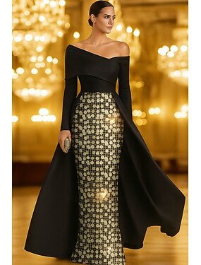 Linea ad A Lunghezza al pavimento Abito da ballo con mantello Abito da Sera Abito formale Elegante Vintage Floreale Manica Lunga Senza Spalle Matrimonio Formale Mantelle Raso Jacquard con Stampa