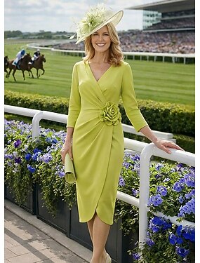 Tubino Colonna Abito Lunghezza al ginocchio Abito Derby Abito da cerimonia per signora Manica 3/4 Scollo a V Elegante Derby del Kentucky Tessuto Elasticizzato con Pieghe Arricciato Drappeggio